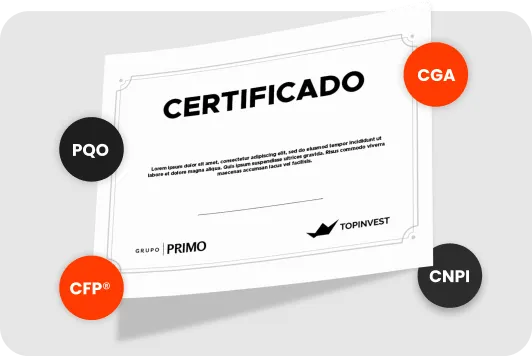 Você precisa tirar um certificado de conhecimento para trabalhar com investimentos, seja na XP, no Grupo Primo ou em qualquer outra instituição. Assessores de investimento precisam passar na prova da Ancord e consultores de investimento devem passar na prova do CEA. Os alunos do MBA poderão escolher um curso preparatório gratuito da TopInvest: ou para a prova do CEA ou para a prova da Ancord. Caso deseje adquirir qualquer outro preparatório da TopInvest - como CFP®, CNPI, CGA, PQO - os alunos terão 50% de desconto na TopInvest.