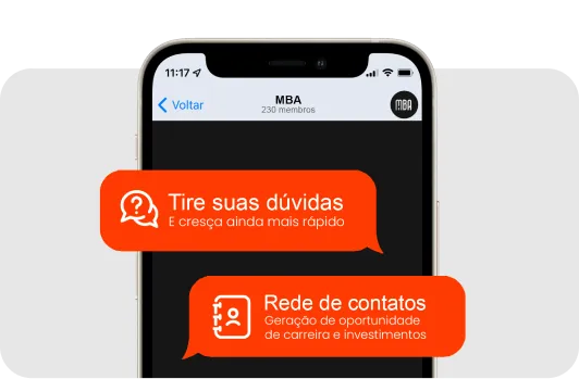 Queremos formar a maior comunidade de especialistas em investimentos do Brasil. Os alunos poderão entrar em um grupo de Telegram para trocar experiências e opiniões sobre o conteúdo do MBA e sobre o mercado financeiro. E você montará desde já uma rede de contatos que pode gerar oportunidades de carreira e de investimentos mais adiante.